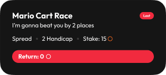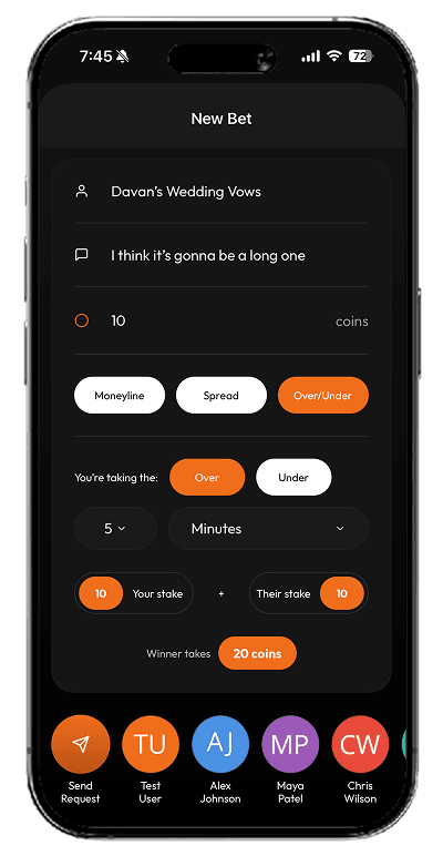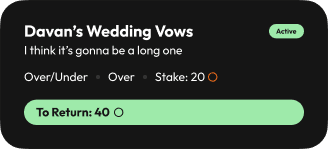 Name it, set the terms, pick the odds, and lock in the stakes. Send it to a friend and you’re both on the record, no backing out or “wait, that doesn’t count” later.